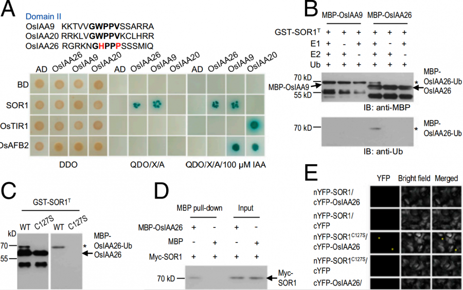 植物激素生长素和乙烯协同调控植物根的生长。乙烯促进了生长素的合成与运输,生长素受体TIR1/AFB2感受到生长素后,结合并泛素化转录抑制子Aux/IAA蛋白,使其通过26...