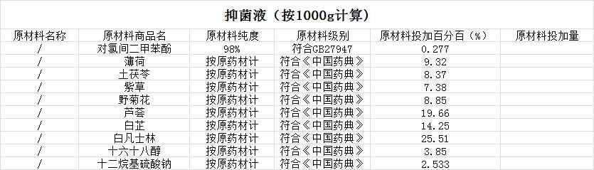 如图,已知要生产的抑菌液的总重量,以及各药材的纯度和原材料投加百分比,如何计算各个原材料投加量是多少
