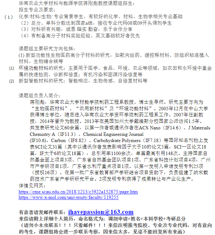 有意者请邮件联系('jwanghunnu.edu.cn'),站内回复不予应答。招生要求:考研分数超过2021考研国家线,报考院校为湖南师范大学或为211及以上,及中科院附属院所,本科为化学相关专业,报考专业要求为有机或化工(一志愿本校考生),化工及相关工科专业...