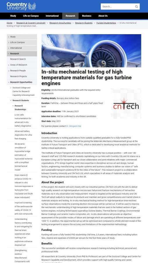 英国考文垂大学招全奖博士一名-航空发动机高温材料