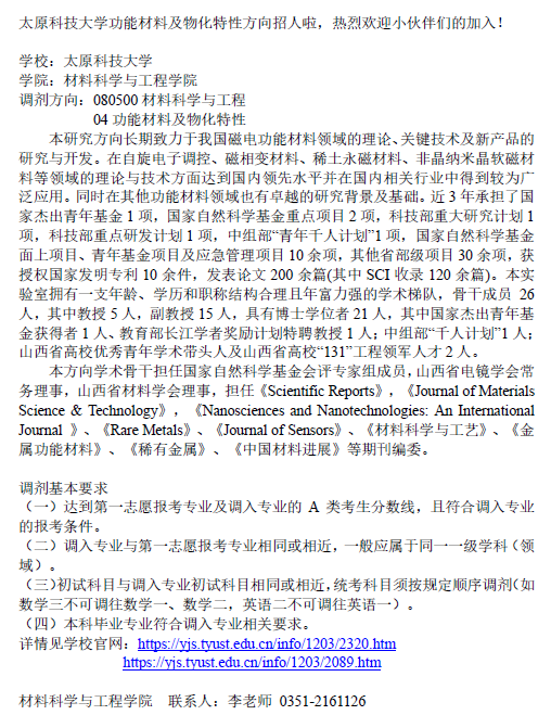 各位同学,苏州科技大学化生材料工程学院拟二次开通调剂系统(12点整已开,开通12小时,今晚12点关闭),给我院明确的名额为化学工艺(1人),应用化学(3人),资源与环境专硕(13人)。时间紧张,请各位老师帮忙联系推荐考生填报调剂系统,学院拟定于明天下午2点复试...