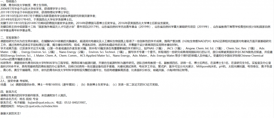 化学和材料化学相关专业,掌握物化,有机,分析化学知识。学硕,总分过国家线。导师:蒲守智教授,江西省二级教授、博士研究生导师。2003年获得清华大学博士学位,现任江西科技师范大学副校长,分管学校科研、学科及研究生工作,我校化学一级学科带头人。获国务院特殊津贴获得...