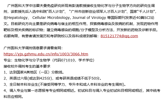 广州医科大学中法霍夫曼免疫研究所招收生物化学与分子生物学调剂生