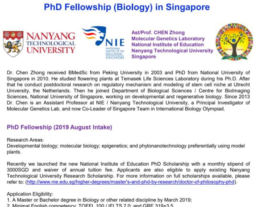 2019年秋季入学,有奖学金,最高每月3000新币,约合1万五千人民币/月研究方向:Developmentalbiology;molecularbiology;epige...