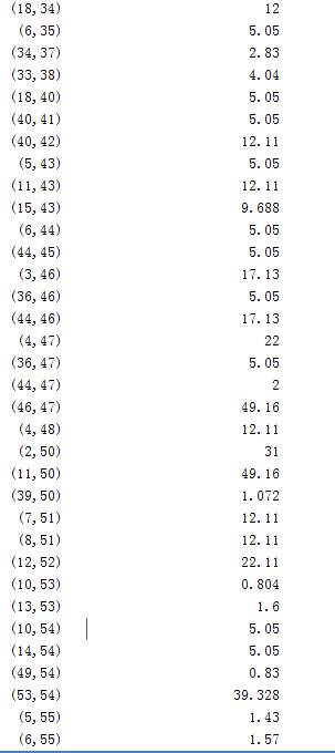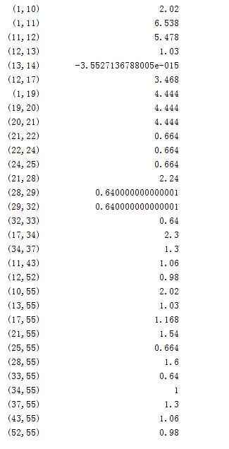 为什么我用FF最大流算法得到的计算结果比实际预期结果偏小?以下是我设定的容量矩阵和结果的流量矩阵。2,10,11,19是实际源点,1是虚拟源点。文章的算例结果是40几,我得到的结果只有13!而且中间一个源点根本没用到。 结果的流量矩阵 |