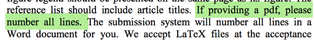 绿色部分文字是这样的:"If providing a pdf, please number all lines." 这是某杂志对提交pdf格式稿件的要求,大神们,我的问题是:“number all lines”具体是什么意思呢?不胜感激各位 发自小木虫IOS客户端 |
