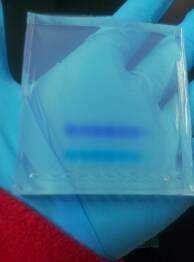 可以的胶回收了,前面的蓝色的条带是溴酚蓝,代表的片段大小是 300bp,后面的有点绿色的条带是二甲苯青,代表的片段大小在4000bp左右。 loading buffer的功能主要有两个。第一,里边的指示剂溴酚蓝和二甲苯酚起到指示的作用,显示电泳的进程,以便我们适时终止电泳;第二,里边的成分甘油可以加大样品密度,使样品密度大于TAE,从而沉降到点样孔中,防止样品飘出点样孔。另外,有的Buffer是加有SDS的,一般都会写明。SDS主要是促使聚合酶变性,因为没有除尽的聚合酶会结合在DNA双链上影响它的迁移速率。细胞裂解后的裂解液,加loading 100℃加热,也是为了中止酶促反应,防止提取的蛋白质降解 发自小木虫Android客户端 |