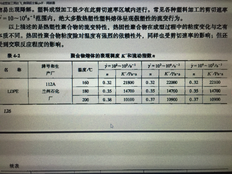 如表格所示:温度160摄氏度时,剪切速率从10的2次方上升到10的4次方,表观稠度K'从21800Pa s上升到22100? 为什么表观稠度(黏度)K'随剪切速率增大而增大? LDPE应是剪切变稀的啊? 图片数据来源:周达飞的《高分子材料成型加工》 发自小木虫IOS客户端 |