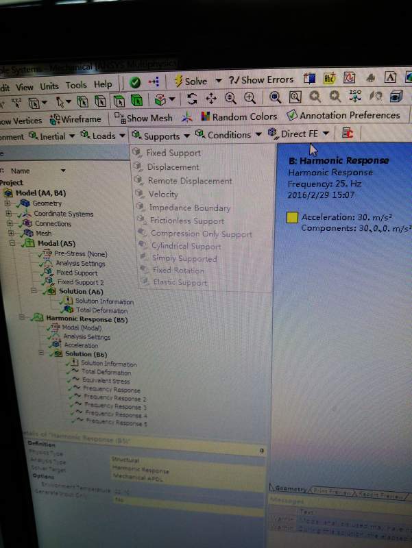 求各位大神赐教,如果单独做谐响应就可以加载约束,我在想是不是模态分析的约束被用在谐响应分析中了,非常着急,谢谢!还有一问题也希望大神赐教,谐响应分析的振幅在哪里加载,比如25-500HZ,振幅1.2mm,振幅在哪边加载?急求!!!