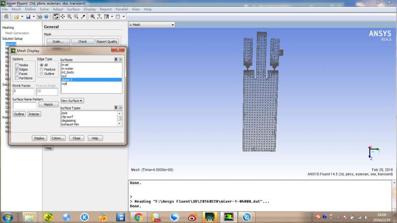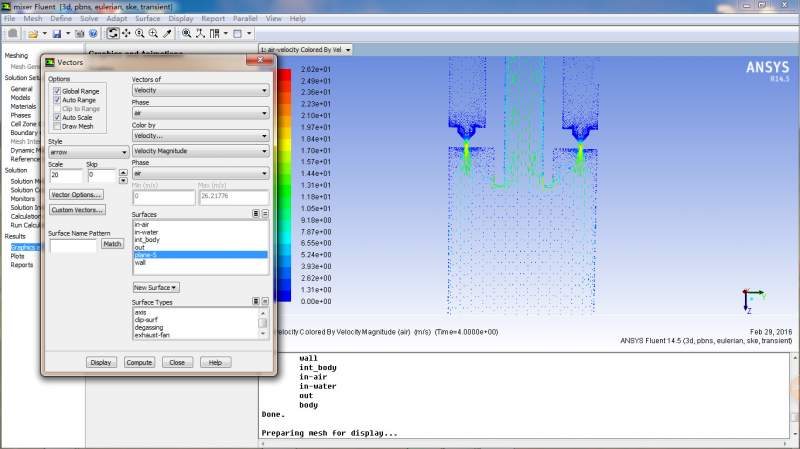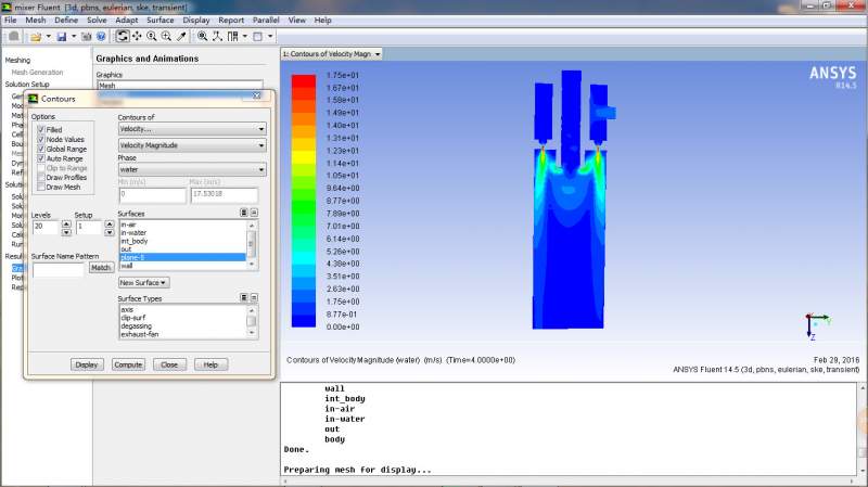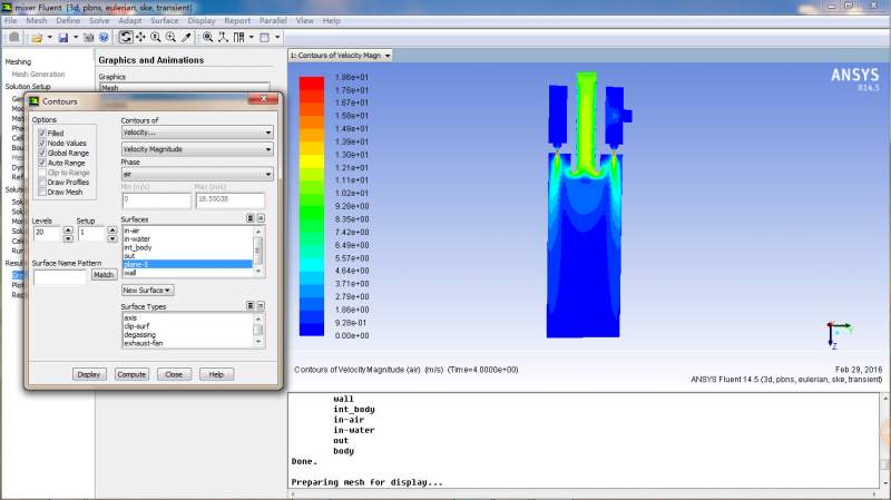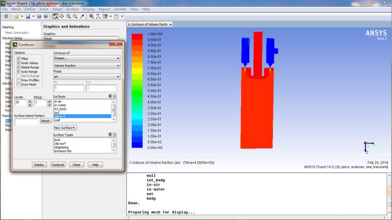 正在做一个混合器的流场模拟,3维的。上面进口进的是空气,侧边进水。空气入口是速度入口,水入口是压力入口。水进入室内,从喷嘴喷出,从而与空气混合。自己做了好多次,模拟结果却不尽如人意。流场总是出不来,总是显示只有一点点组分。自己做的是5s的状态,还是这样,求助。不知道是哪儿错了。求大神指点指点! 21.jpg 12.jpg 13.jpg 14.jpg 15.jpg 16.jpg 17.jpg |