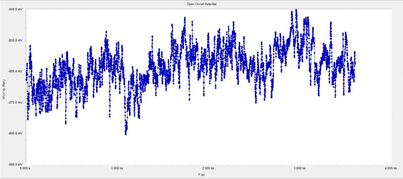 请帮忙分析一下下面的测试结果,材料为7系铝合金,腐蚀介质为Nacl溶液,扫描参数:±300mv VS Ocp,扫描速度为1mv/s,开路电位测得-0.85V左右,小弟不知为何在阳极极化区扫描后期的数据如此杂乱,请各位大神提供一些思路,什么原因导致的? 开路电位.png 极化曲线.png |