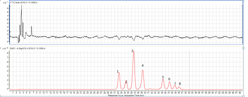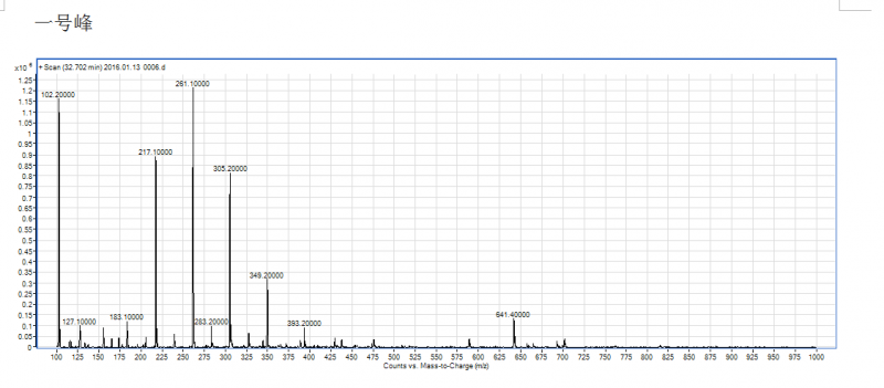 新鲜骏枣乙醇提取物,用氯仿萃取的,然后跑液质(流动相甲醇)成分分析,这几个物质最大光谱吸收值315,请各位大神帮忙解谱。谱图如下: lc-ms图谱.png 一号峰.png 二号峰.png 三号峰.png 四号峰.png 五号峰.png 六号峰.png |
