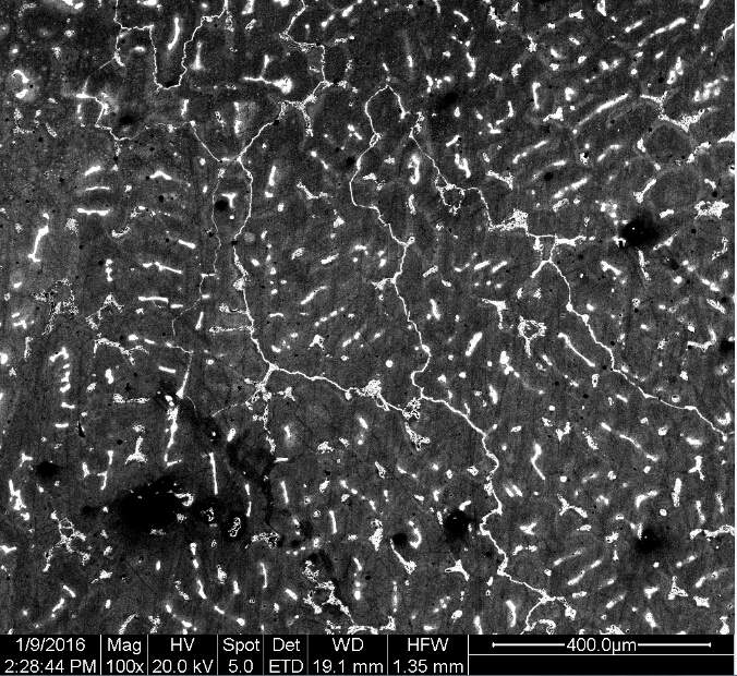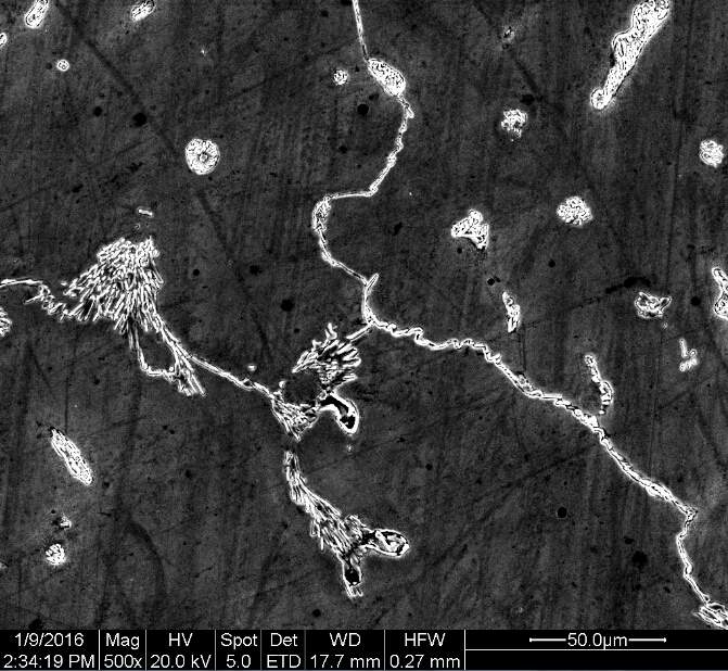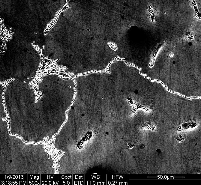 材料是奥氏体耐热钢,成分是德国的1.4837,具体成分:C0.36 Si2.29 Mn1.04 Cr25.86 Ni11.87 V0.11 浇铸出来后出现如图链状碳化物,不知道这种碳化物是什么碳化物,XRD分析也没分析出来。有没有大神懂的,给小弟指点指点。 1.jpg 2.jpg 3.jpg 00-0-1.jpg |