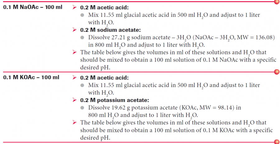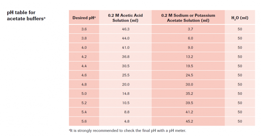 做实验要用到100mM,pH=3的醋酸盐缓冲液,以及10mM,pH=5的醋酸盐缓冲液,哪位虫友知道配制方法,多多指教。谢谢啦 |