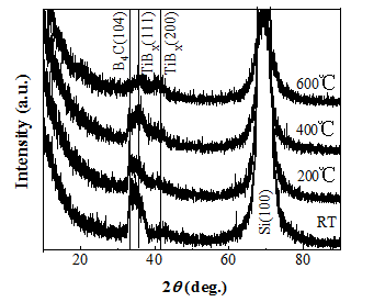 这是 0.5Pa,不同基底温度下nc-B4C/a-Ti纳米复合膜的XRD图谱。 The B4C(104), TiBX(111) 和 TiBX(220)峰这些晶向是怎么读出来的啊,给分析一下XRD的工作原理吧,甚是不解,求大神、、、 `8INO$VB[]E4GG1@B$NO~R0.png |