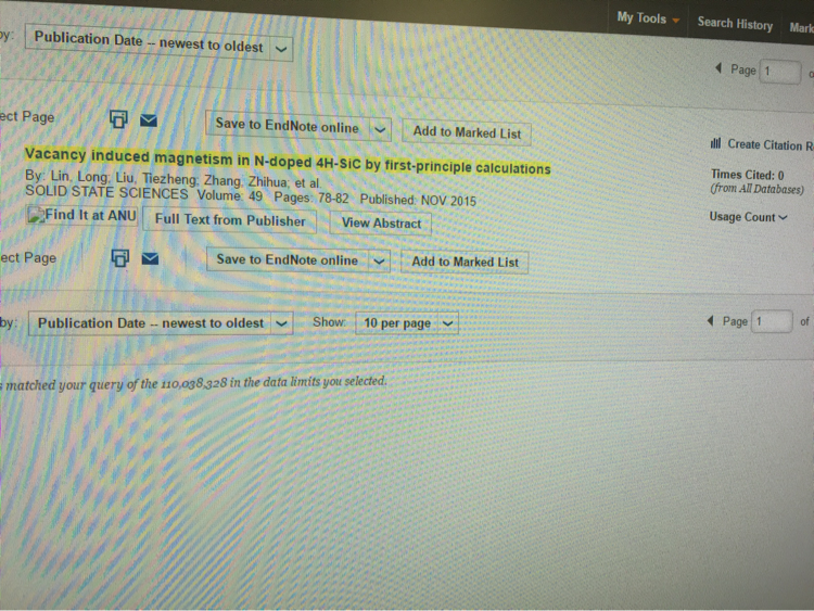 请同仁帮忙提供以下两篇论文的Web of science (SCI)检索证明,只要将被检索的网络截图发给我即可。谢谢!添麻烦了 1. D. Sun, M.X. Wang, Z.H. Zhang*, H.L. Tao, M.He, B. Song, Q.Li, Effects of inverse degree on electronic structure and electron energy-loss spectrum in zinc ferrites, Solid State Communications 223 (2015) 12–15。 2. Long Lin, Tiezheng Liu, Z.H. Zhang*, Hualong Tao, Ming He, Bo Song, Zhanying Zhang.Vacancy induced magnetism in N-doped 4H–SiC by first-principle calculations, Solid State Sciences, 49, (2015), 78–82. |