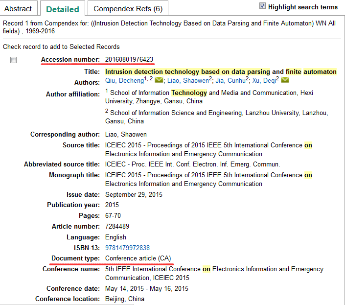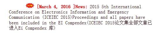 2015 5th International Conference on Electronics Information and Emergency Communication (ICEIEC 2015)Proceedings and all papers have been included in the EI Compendex 哪位好心朋友帮忙查询一下,谢谢! ICEIEC2015.jpg |