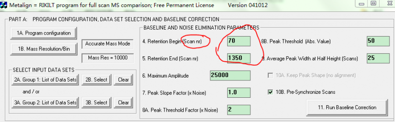 http://www.mdpi.com/toc/htmlview ... 1424-8220/10/8/7122 我猜应该是扫描开始的时间和扫描结束的时间,也就是选一段色谱数据(在你设置的retention begin 和retention end之间)进行背景扣除和噪音消除,如果要进行全谱处理,应该是0到扫描点总数。 |