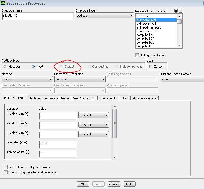 fluent DPM模型中设置injection中particle type的droplet灰色不可用怎么回事?