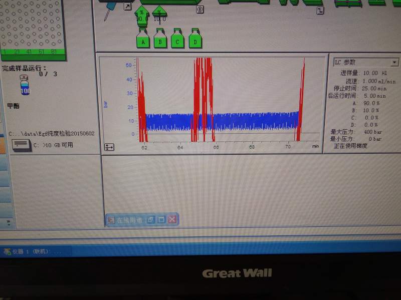 大家好,有哪位高手遇到过图片的现象,考虑过流通池、液相泵的出口阀、入口阀问题,也将上诉零件拆下洗过,可排除流通池、泵的问题,现在没连接色谱柱,直接连两通阀,想不出哪里的问题。有谁遇到过这样的状况,请高手指点一下????? IMG20160308105901.jpg |