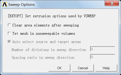 在Sweep Options对话框中如何将自动选择源面和目标面取消