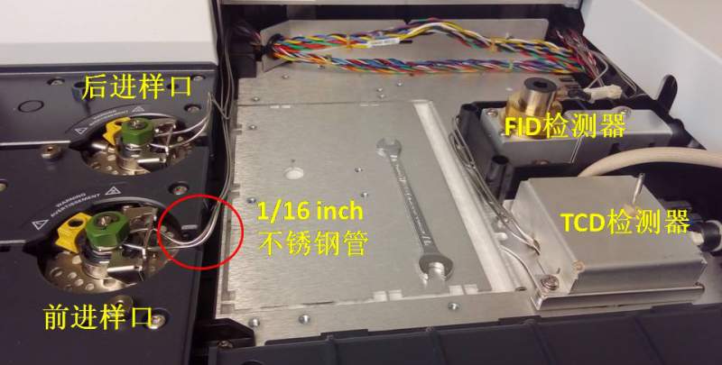 实验室有台新买的安捷伦7890B,以前一直用进样针进样。现在导师购买了vici valco公司的六通阀,希望通过六通阀进样。各位大神,请问如何连接安捷伦的载气管路和六通阀?是从图中红线标记的1/16英寸的不锈钢管处截断,然后分别连接六通阀相邻的两个口吗?有两根平行的不锈钢管,用哪根合适呢?对安捷伦的管线不熟悉,望各位大神悉心指导!非常感激! GC如何连接六通阀.jpg |