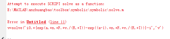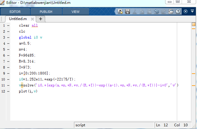 公式中n是摩尔量,F为法拉第常数,R是气体常数,T是温度,i 是电流,v是电压,i 是自变量,v是因变量,i0是极限电流。我想通过 i 求出v,画出 i 和v i0=1.252e11*exp(-22175/T) i=i0*{exp(a*n.*F*v/(R*T))-exp((a-1)*n*F*v/(R*T))},运算这个公式的时候,一直提示我错误,我想求助一下,我哪里出错了 |