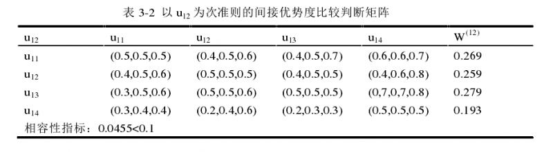 各位大神,在计算二级权重时,在元素集U1中,以元素U11为次准则,元素集U1中的元素U11、U12、U13和U14按照对U11的影响大小进行优劣度比较,利用F-ANP求解,得出权重向量W(11),这个过程怎么来的,图中这些数据是依据什么得到的 tup.png |