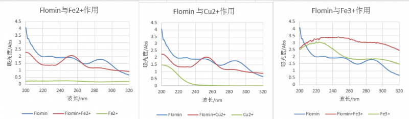已知,药剂为两种化合物的混合物,Flomin两个吸收峰分属两种化合物。其与三种金属离子作用的紫外光谱分析结果如图。能说明该种药剂可能与哪种离子作用,具体是哪种化合物在起作用吗?