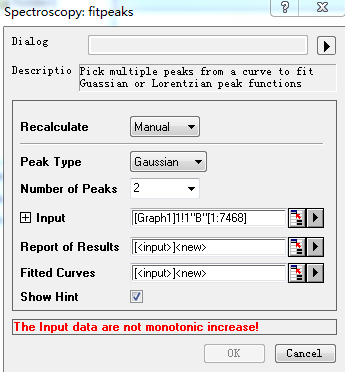 分峰拟合时图片如下,,进行平滑等处理后还是显示如此,提示说 the input date are not monotonic increase,OK键灰色,请问如何处理? 4)E(KSMI1)9F7~HK8%8FQ14.png |