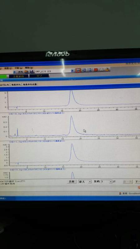 做舒尼替尼液相,C18柱,流动相为乙腈:水=65;35,流速为1ml/min,进样40分钟后仍未出峰,只有溶剂峰,求助各位大神可能的原因有哪些? 调整流动相极性,乙腈100%,终于出峰了,但是出峰特别小是为什么?怎么改善呢?标准品浓度为0.2mg/ml 液相.jpg |