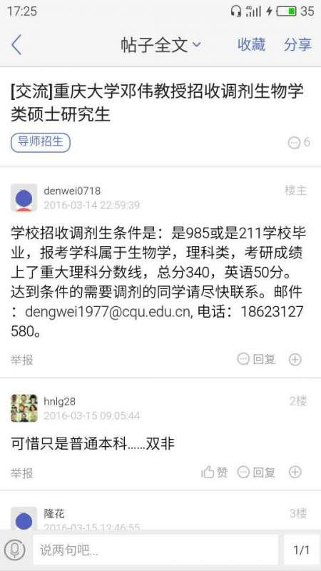 | 今年报考中科院北京基因组研究所基因组学方向,初试成绩: 总分 360 政治 66 英语58 生物化学与分子生物学 116 细胞生物学 120。六级已过。希望觉得我合适的老师能够给我一次面试的机会。联系邮箱:15065752029@163.com |