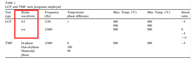 如图,是08年发表在 国际疲劳 上的文章, 论文题目Thermo-mechanical fatigue failure of a single crystal Ni-based superalloy 其中涉及到了低周疲劳试验,但却没有说明其中s-s 和f-f 分别是什么样的波形 WA$Z3MAEE)9KB7DKQBGU6}Q.png |