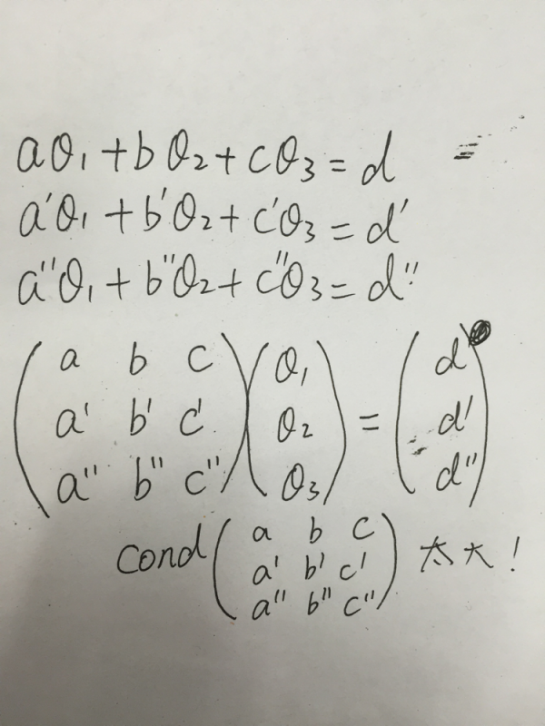 如图,在图片中的方程里,未知数是theta 1、theta2、theta3,理论上,若已知三组不同a、b、c、d的值,就可以求出来三个未知数。问题来了,三组a、b、c、d只有细微的不同,使得条件数太大,怎么改进方程? 发自小木虫IOS客户端 |