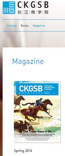 CKGSB Knowledge is an English language business publication focused on China. It features original articles on business and economy in China, the evolution of “Made in China”, policy issues, the rise of Chinese companies, the emergence of Chinese multinationals, and foreign multinationals’ strategy and operations in China. It also features interviews with influential thought leaders and CEOs, both Chinese and global, on trending topics. CKGSB Knowledge provides a unique vantage point from which to discover the latest general and China-specific business trends. It also provides a matrix to understand how emerging markets are transforming the global business landscape.每年 Spring.Summer.Fall.Winter四期 希望大家能喜欢![CKGSB Knowledge 长江商学院 2016 Spring]()