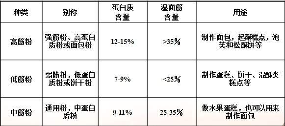 有一个范围的。 高筋粉:蛋白质含量在10.5-13.5% ,颜色较深,本身较有活性且光滑,手抓不易成团状;比较适合用来做面包,以及部分酥皮类起酥点心,比如丹麦酥.在西饼中多用于在松饼(千层酥)和奶油空心饼(泡芙)中.在蛋糕方面仅限于高成分的水果蛋糕中使用. 中筋粉:蛋白质含量在8.0-10.5%,颜色乳白,介于高、低粉之间,体质半松散;一般中式点心都会用到,比如包子、馒头、面条等.(市售面粉无特别说明的一般都是此类面粉). 低筋粉:蛋白质含量在6.5-8.5%,颜色较白,用手抓易成团;蛋白质含量低,麸质也较少,因此筋性亦弱,比较适合用来做蛋糕,松糕,饼干以及挞皮等需要蓬松酥脆口感的西点. 发自小木虫Android客户端 |