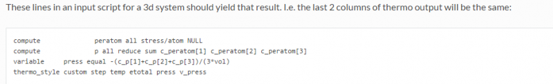 先看看公式: compute s all stress/atom 计算的时候有否考虑动能项? 现在的版本,貌似需要你指定计算动能项的方式,楼主是如何计算该项的? thermo_style中的pxx肯定是考虑了动能项,并且计算该项时用的速度是绝对速度。(详细请看http://lammps.sandia.gov/doc/thermo_style.html) 我想可能这就是区别。 楼主做的又是拉伸,采用绝对速度和脉动速度计算出的动能项应该很不一样吧, |