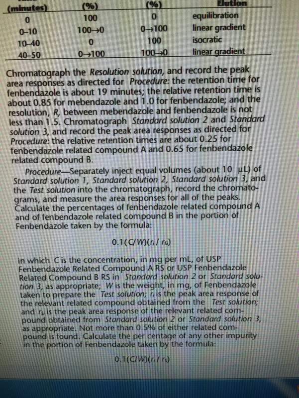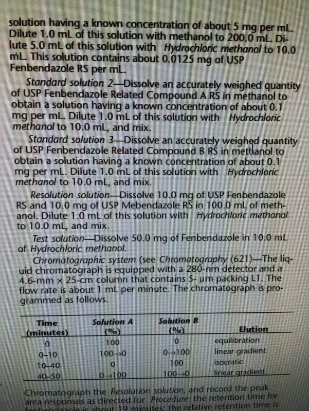 各位药物分析同仁: 现发现芬苯达唑(fenbendazole)USP35版中,有关物质检查项(related compounds)下,杂质定量计算的公式出现了错误,理论上是不会错的,实际我看了几遍,觉得不合理。请大家帮忙看看。附件附图,也可自行在线查询USP35 IMG_0738.JPG IMG_0739.JPG |