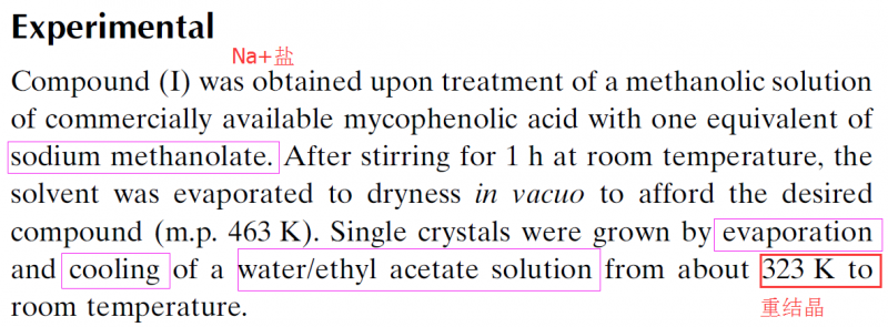 Compound (I) was obtained upon treatment of a methanolic solution of commercially available mycophenolic acid with one equivalent of sodium methanolate. After stirring for 1 h at room temperature, the solvent was evaporated to dryness in vacuo to afford the desired compound (m.p. 463 K). Single crystals were grown by evaporation and cooling of a water/ethyl acetate solution from about 323 K to room temperature. 请教虫友们这个晶体培养问题,用乙酸乙酯和水混合是怎么结晶出晶体的,这篇文章的这个具体步骤与原理是什么?谢谢 |