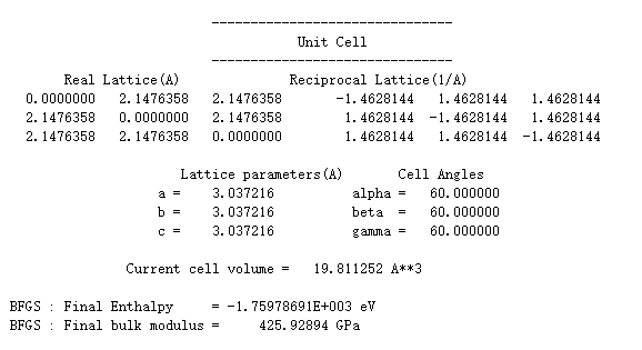 【用MS计算晶格参数、形成能】 TiC 初始设定:空间群为225(同NaCl),晶格常数4.32。 建立晶胞结构后,添加Ti原子,坐标(0,0,0);再添加C原子,坐标(0.5.0.5,0.5).用LDA最优化晶格结构,最后得到:晶格常数3.037。体积模量425。而论文中LDA数据:晶格常数4.299。体积模量243。差异这么大,原因在哪儿? 计算结果.png |