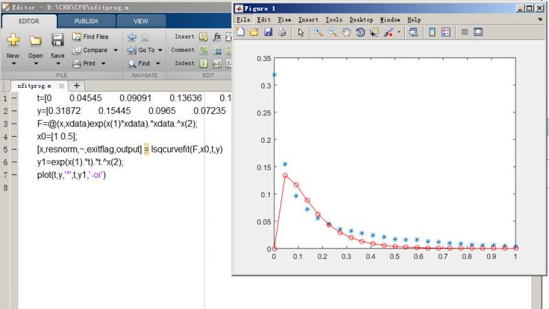 求助大神,如何用matlab拟合下面的数据,函数形式为y=exp(b*x)*x^a x=[0 0.04545 0.09091 0.13636 0.18182 0.22727 0.27273 0.31818 0.36364 0.40909 0.45455 0.5 0.54545 0.59091 0.63636 0.68182 0.72727 0.77273 0.81818 0.86364 0.90909 0.95455 1]; y=[0.31872 0.15445 0.0965 0.07235 0.05575 0.0448 0.0354 0.032 0.02773 0.02378 0.02095 0.01708 0.01553 0.01542 0.01248 0.01168 0.0097 0.00865 0.007 0.00607 0.0056 0.00445 0.00392]; 试了几次都报错了。。。求大神给一种可用的算法~ ![]() |