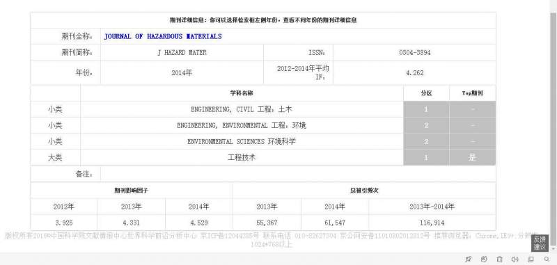 | 大家好,求助Journal of hazardous materials 这个期刊在中科院JCR期刊分区数据在线平台这一数据库中的分区情况,网址为:https://www.fenqubiao.com/。需要账号密码再能登陆,识别IP。 |