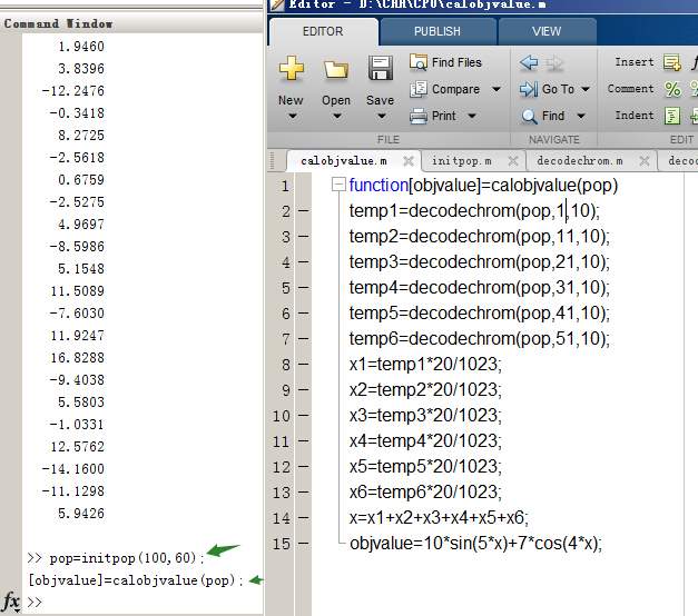 calobjvalue.m文件中的程序用来计算遗传算法中的目标函数,我的种群包括20个个体(每个个体中有6个变量),需要计算每个个体的适应度,下面是程序: function[objvalue]=calobjvalue(pop) temp1=decodechrom(pop,1,10); temp2=decodechrom(pop,11,10); temp3=decodechrom(pop,21,10); temp4=decodechrom(pop,31,10); temp5=decodechrom(pop,41,10); temp6=decodechrom(pop,51,10); x1=temp1*20/1023; x2=temp2*20/1023; x3=temp3*20/1023; x4=temp4*20/1023; x5=temp5*20/1023; x6=temp6*20/1023; x=x1+x2+x3+x4+x5+x6; objvalue=10*sin(5*x)+7*cos(4*x); 运行后提示: >> calobjvalue Error using calobjvalue (line 2) Not enough input arguments. 这一段程序应该怎么改呢?求助各位大神~ |
