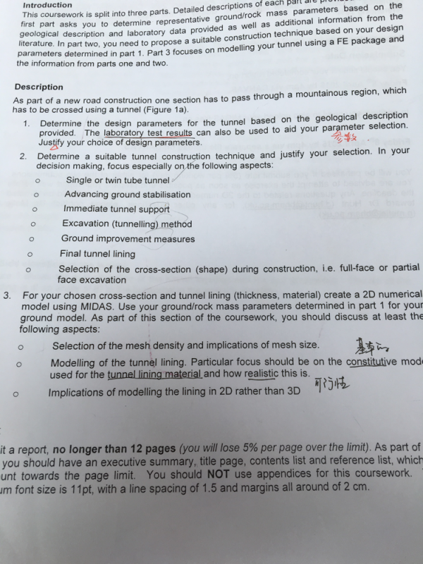 MSc在读,这门课是underground construction,要完成一个course work,但是本人从来没学过隧道方面的任何东西……现在感觉不知道怎么动手,就是老师告诉你大的背景条件是mudstone,多裂缝,一个穿山的3km隧道设计包括参数选择、截面设计、施工方法以及midas二维建模。 我现在的问题是我查到我的应该是D3M即双向三车道,准备设置独立双洞,仅仅知道三道大概是3.7X3m(uk标准)然后题目已知净高(这里指建筑界限)4.5m,我不知道这个横截面应该怎么取?方法还是准备用新奥法,所以估计三心拱或者五心?但是我没做作midas数值模拟,新奥法里的锚固部分怎么在midas里全程再现?急求谢谢各位大神指导!附图要求以及断面图,还有就是不知道参数怎么取? 发自小木虫IOS客户端 |