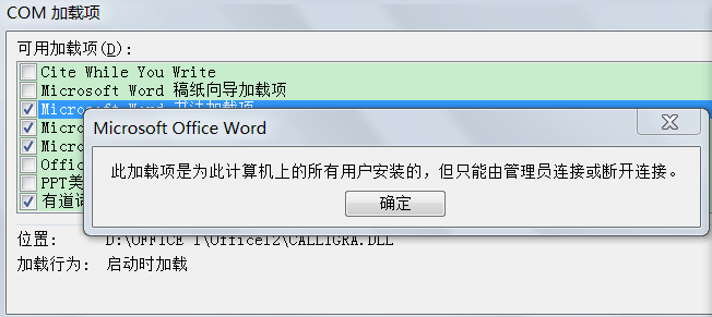 重装endnote 后也不能加载,word2007版本,找到Word 的COM加载项后,要加载Cite While You Write,点击后弹出对话框“次加载项是为计算机上的所有用户安装的,但只能由管理员连接或者断开连接”,但是我已经是管理员身份登录了,卸载后重启再装也是这样,不知道什么情况,请大家帮助! M_GPMPSA[M7VB4C%VAI@OQ1.png |