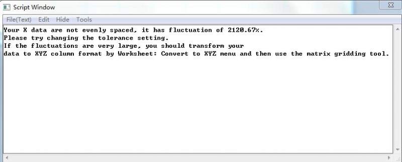 第一个问题是数据表里面是x,y,z的坐标都有嘛?生成矩阵的时候出现这个问题是什么原因? http://www.officezhushou.com/origin/883.html按照这个教程操作的 我调节上述链接里的教程说的Even Spacing Relative Tolerance (%) 值,也不行,什么原因? 1.jpg |