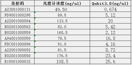 如题 最近做实验需用到FFPE样本DNA,但是分别用两种检测方法测定浓度后发现差别太过诡异。可有大神帮忙解惑,感激不尽! 如图:前一列为分光光度计测定的浓度,后一列为Qubit3.0测定的浓度。 浓度对比表.png |