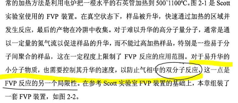 有两个疑问:1)FVP时是不是一定要先把样品升华后,N2通入1000度的炉子里,要是直接在炉子里烧的话,是不是就基本是碳化了(我的是小分子,沸点200度以下)。2)如下图横线处,气象双分子反应是什么意思?我第一次做,不太清楚,求大神。 fvp.JPG |