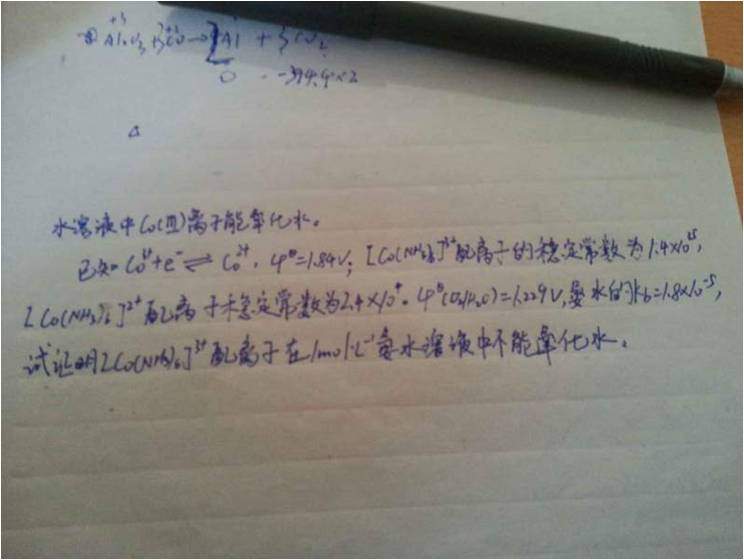 根据络离子的稳定常数和氨的浓度,可以计算出溶液中游离的三价钴离子,根据能斯特方程,求出这时候钴的电极电势,只要比水的电极电势小,水溶液中钴离子就不能氧化水。这就是思路。 发自小木虫Android客户端 |