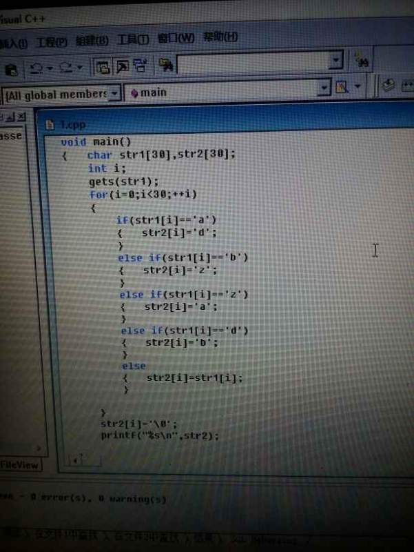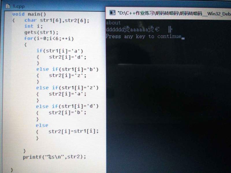 char str1[6]; char str2[6]; for (int i=0;i<6;++i) { if (str1=‘a‘) {str2=’d‘;} elseif (str1=’b’) {str2=`z`;} elseif (str1=`z`) {str2=`a`;} elseif (str=`d`) {str2=`b`;} else {str2=str1;} cout<<str2<<endl; [ 发自手机版 http://muchong.com/3g ] |